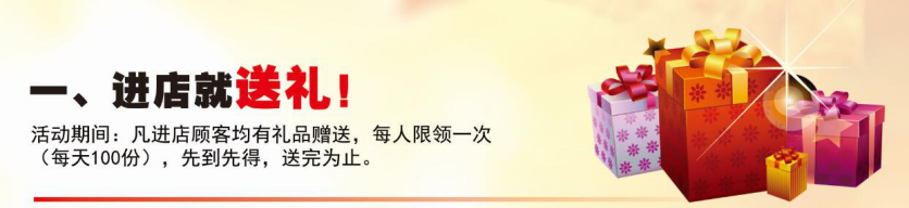 活动期间:凡进店顾客均有礼品赠送,每人限领一次(每天100份),先到先得,送完为止。